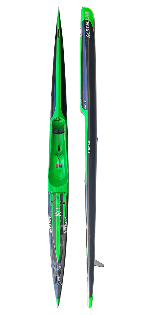 The new Stellar Eagle features a new seat, footboard, low volume cockpit replacing the revered SEL with a modern racing machine for the larger paddler. Highly adjustable foot tracks allow for a large range of paddler size, redesigned gunwales for a tighter catch, refined seat for an ergonomic and comfortable seating position. The bow deck is optimized for comfort in multiple wind situations and control while steering. The hull is re-formulated for second to none paddling experience ensuring a smile on your face and podium finishes. For those familiar with the Stellar line, the Eagle could be compared to a narrower, faster Falcon melded with the SEA.